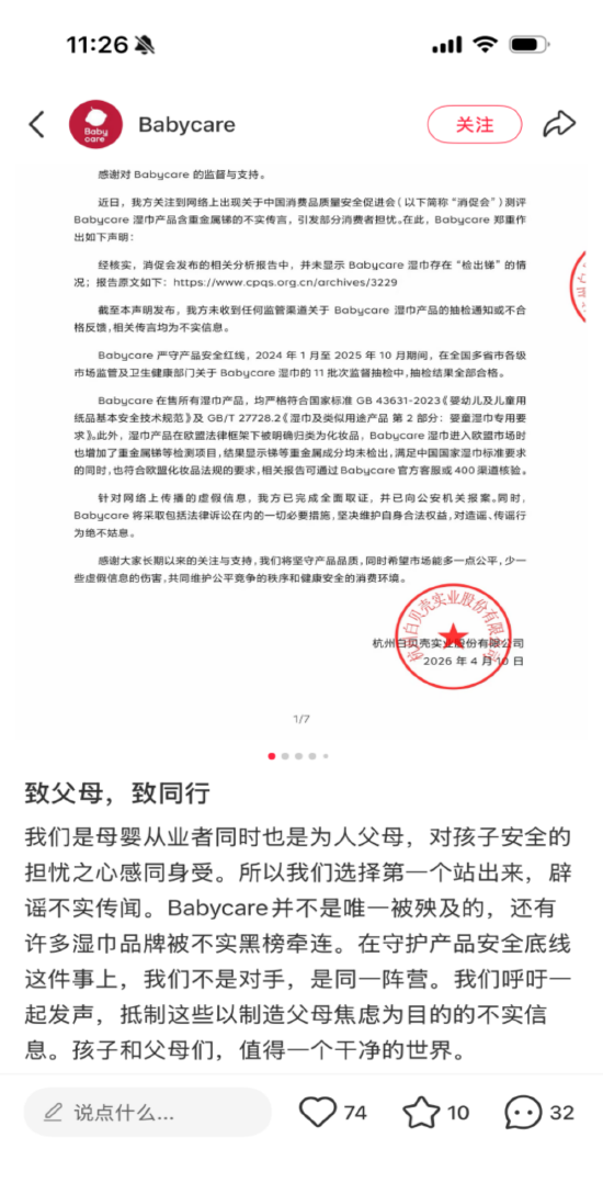 4月11日,Babycare发布声明辟谣近期社交媒体上传播的“消促会测评Babycare湿巾产品含重金属锑”等相关传言为不实信息。事件起因是中国消费品质量安全促进会在4月发布的一份《网售婴幼儿湿巾产品质量监测结果分析报告》。该报告检测了21个湿巾品牌,并指出“基础性指标和卫生指标整体表现良好”。在非国标要求的重金属锑检测中,报告称有20个样品检测出不同程度的总锑含量,但并未点名具体品牌。然而,报告发出后被营销号恶意剪辑、拼接不实图文和短视频内容,编造并传播“Babycare、德佑、维达等知名品牌湿巾重金属锑超标”、“致宝宝皮肤损伤”等不实信息,引发母婴群体焦虑。Babycare表示已第一时间向公安机关报案,并将采取包括法律诉讼在内的必要措施,坚决维护企业声誉与消费者权益。公司呼吁受害品牌一同发声,抵制这些以制造父母焦虑为目的的不实信息。“我们是母婴从业者同时也是为人父母,对孩子安全的担忧之心感同身受。”Babycare表示:“孩子和父母们,值得一个干净的世界。”包括Babycare、德佑、维达等品牌在内的多个品牌均向消费者提供了产品经权威第三方检测机构检测后重金属等指标合格的报告,显示“未检出”。